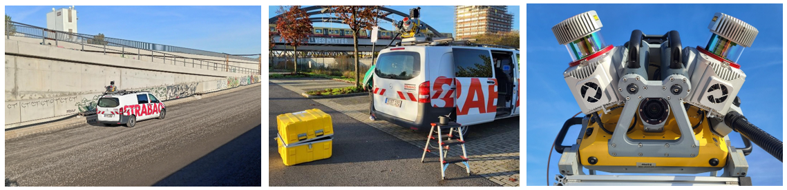 Das mobil Mapping mit dem Trimble MX9 ist ein leichtes und kompaktes System zur mobilen Datenerfassung. Bei Fahrten mit einer Geschwindigkeit von bis zu 110 Km/h können präzise Punktwolken im fließenden Verkehr erstellt werden. Zusätzlich nimmt eine 360°-Kamera das befahrene Umfeld auf. Die erhobenen Daten eignen sich insbesondere für den Asphaltbau, das erstellen von Urgelände-DGM´s und Deckenbüchern.